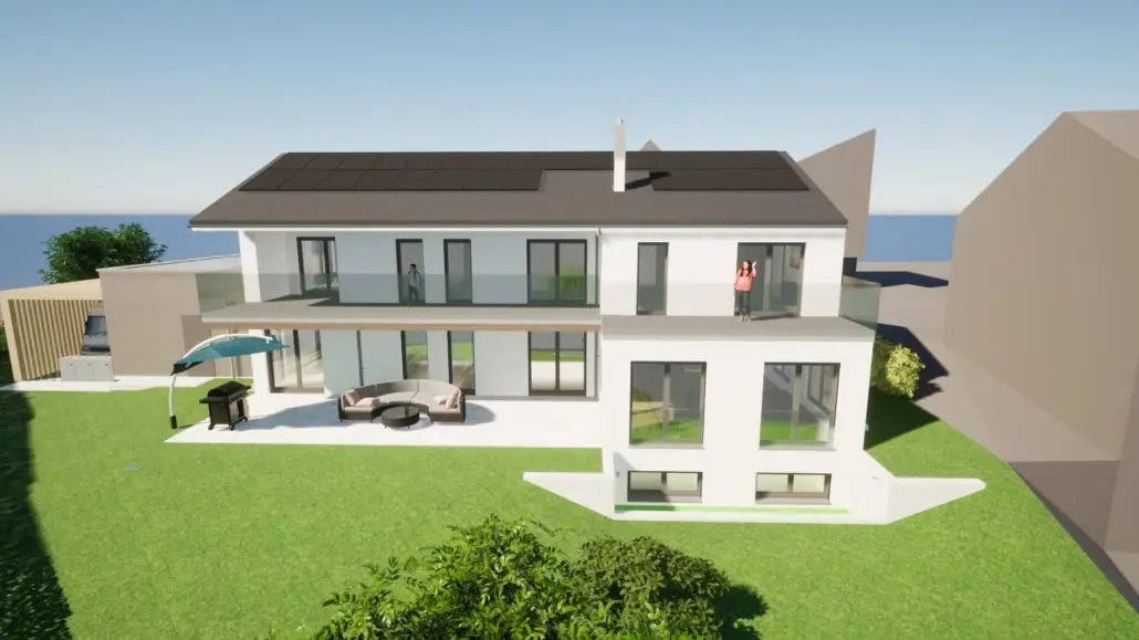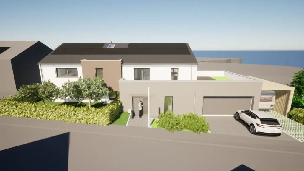 Der Entwurf dieses Einfamilienhauses verbindet eine klare, zeitgemäße Architektursprache mit einer starken Orientierung zum Landschaftsraum. Während sich das Gebäude zur Straßenseite hin maßstäblich und zurückhaltend in die bestehende Umgebung einfügt, entfaltet es zum Garten hin seine volle Offenheit und Großzügigkeit. Die gegliederte Kubatur und die präzise gesetzten Öffnungen schaffen ein ausgewogenes Verhältnis von Privatheit und Weite.