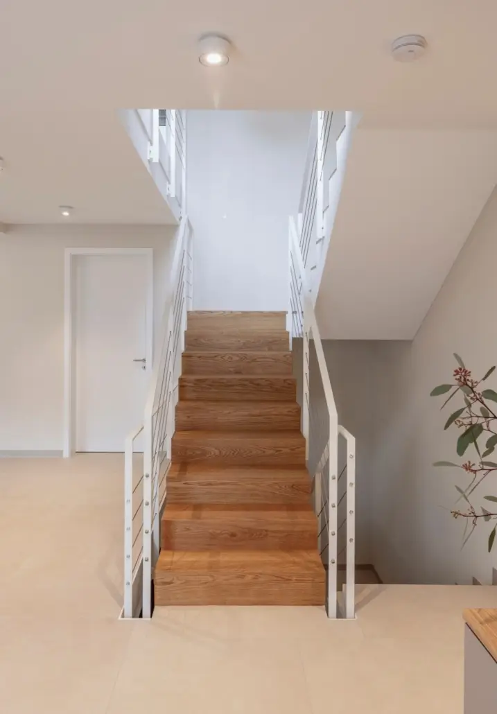 Der Zugang erfolgt straßenseitig über einen geschützten Eingangsbereich, der in das Erdgeschoss mit seinem großzügigen, offenen Wohn-, Ess- und Kochbereich führt. Bodentiefe Fenster sorgen hier für eine helle, fließende Raumwirkung und stellen eine direkte Verbindung zum Garten her. Ein Kamin bildet das atmosphärische Zentrum des Wohnraums. Ergänzt wird das Raumangebot im Erdgeschoss durch ein Arbeitszimmer sowie ein flexibel nutzbares Gästezimmer.