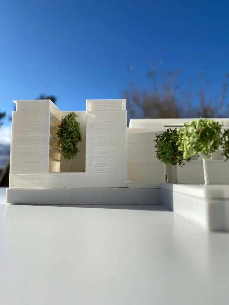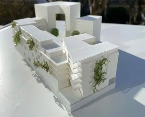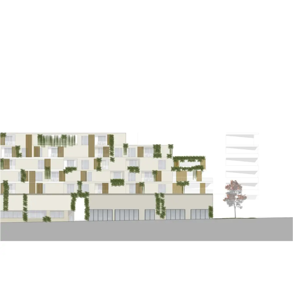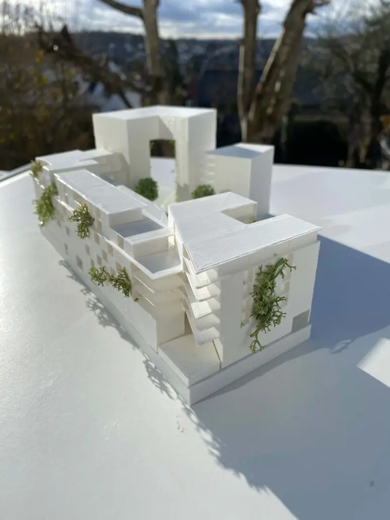 Der Entwurf bildet durch Vor- und Rücksprünge einen baulichen Sonnenschutz. Unterstützend durch die Begrünung und ihre natürliche Verschattung ist es ein gelungenes Klimakonzept.