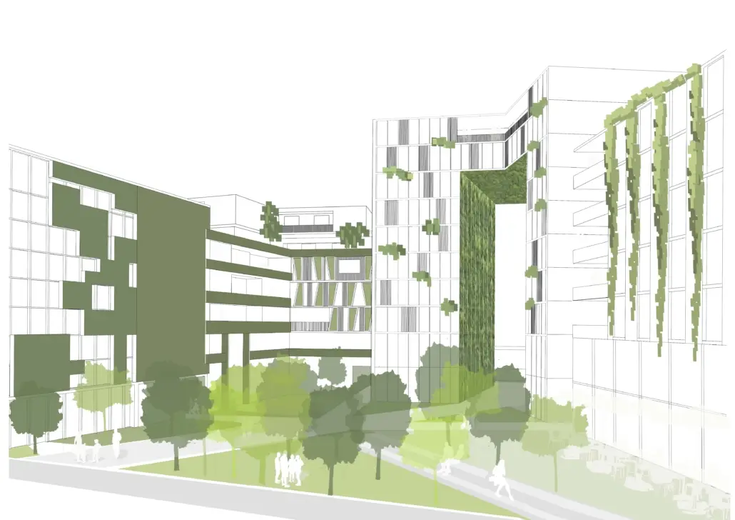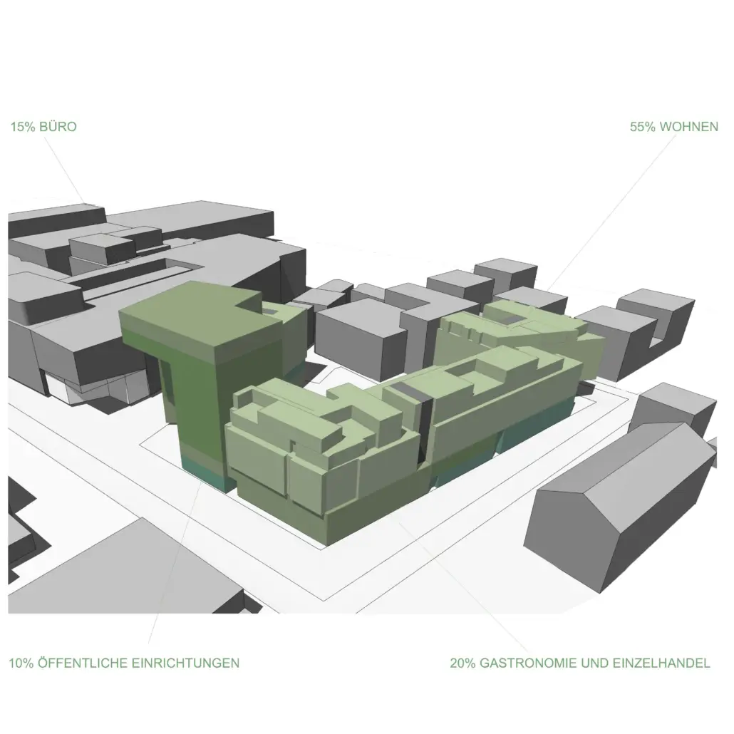 Gleichzeitig schafft das markante 10- geschossige `Grüne Tor´ eine einladende und intelligente Wegeführung in das Quartier und bildet die neue Achse vom Bahnhof in Richtung Elbenplatz.